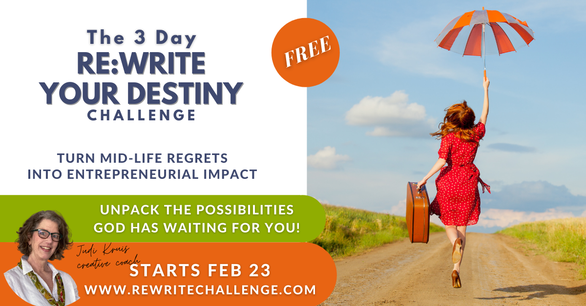 Hi, I’m Judi Kruis, even while working full-time, I continue as an Artist, Writer and Creative Coach and as your guide in the FREE 3 DAY RE:WRITE Your Destiny Challenge.